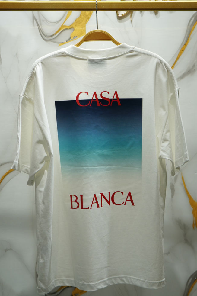 A camiseta Casablanca Gradient Tee traz um visual leve e sofisticado, com a clássica identidade “CASA BLANCA” em vermelho e um quadro central em degradê azul, remetendo ao lifestyle mediterrâneo da marca.