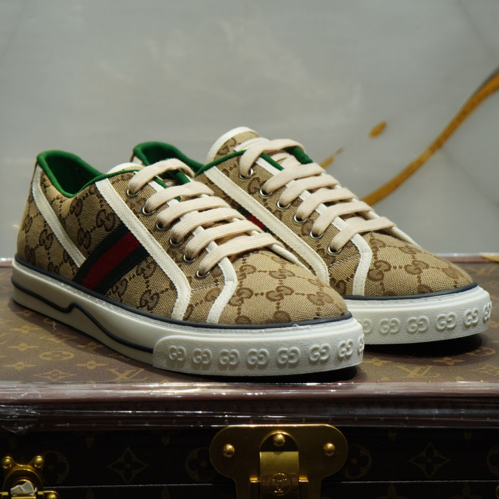 O tênis de cano baixo é apresentado em canvas com GG mini nas cores bege e ébano. O modelo combina diferentes elementos clássicos da marca, como a etiqueta Gucci Tennis 1977, a padronagem GG texturizada e a icônica faixa Web - detalhes que remetem à afinidade Gucci com o mundo dos esportes.