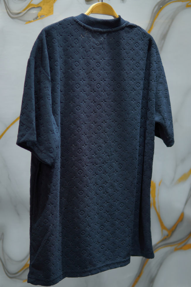 Esta camiseta azul atemporal de algodão orgânico se destaca pela estampa monograma tonal que cobre toda a peça. O padrão jacquard possui acabamento fil coupé, criando um efeito de textura suave. Perfeita para os dias mais quentes, esta camiseta versátil complementa tanto looks casuais quanto mais sofisticados do dia a dia.