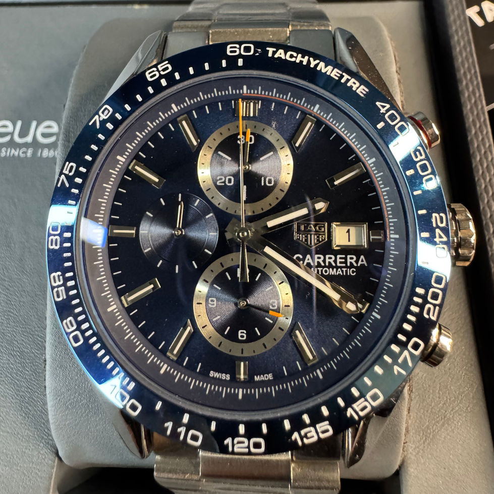 Um TAG Heuer Carrera esportivo que combina um mostrador azul com acabamento raios de sol, a tradicional configuração de submostradores 6-9-12 e uma pulseira sólida em aço em formato de H.